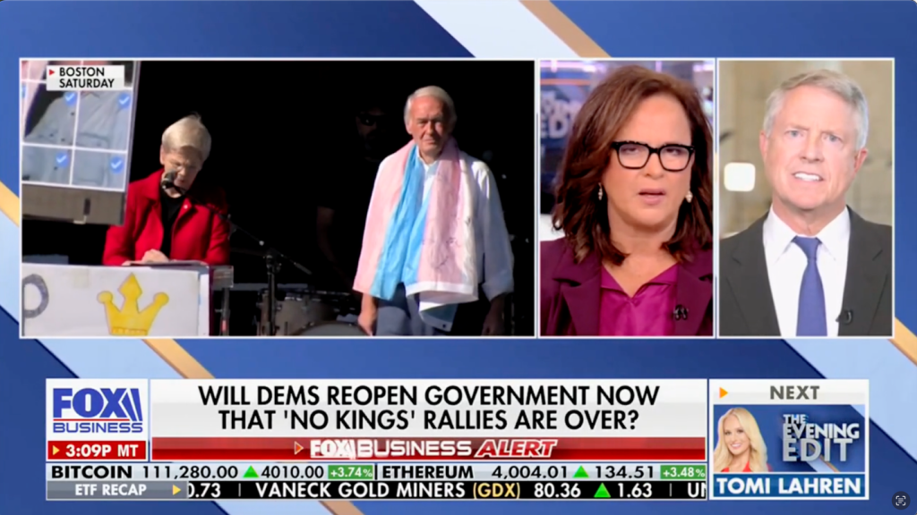 “Liz, they’re not just caving. They are bowing down to the far left. These far-left Marxists have absolutely hijacked their party. Speaker Johnson nailed it right there. Isn’t it wonderful we live in a free country where we can protest, where we can state or speak our mind, all those types of things. But this far left still is in denial. They still are going through anger and denial, stages of grief that they lost the election. Look to the victor belongs the spoils. President Trump is implementing his policy plans back home. People are celebrating. The borders are safe. Their families are safer. The cost of gasoline is down to about two and a half dollars a gallon. Grocery prices are stabilized. Regulations rolling back. Overall, it’s been a very, very successful nine months with President Trump.”