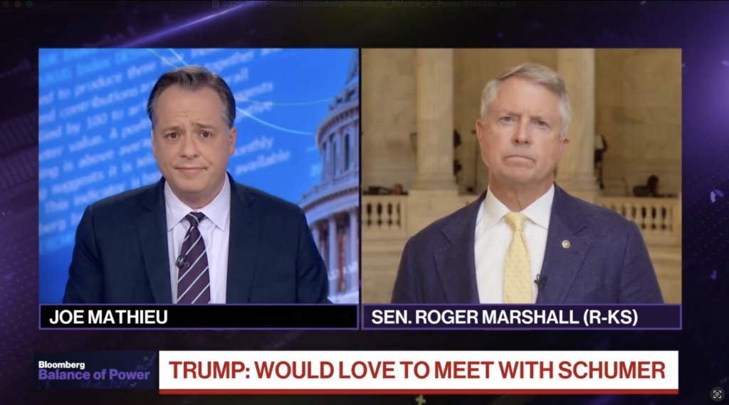 Washington – On Tuesday, U.S. Senator Roger Marshall, M.D. (R-Kansas), joined Balance of Power on Bloomberg to discuss day 21 of the Schumer shutdown and Senate Republicans’ unified stance on Democrats’ political theater, as well as the latest on American beef.